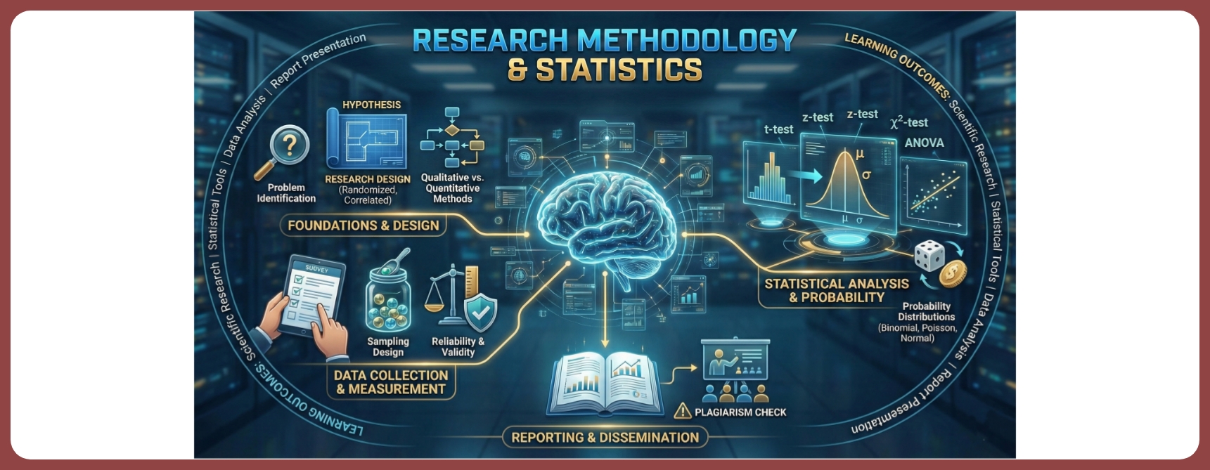 This course (NMEC595 - Research Methodology and Statistics) introduces students to the fundamentals of scientific research, covering the entire research process from problem identification and hypothesis formulation to research design and execution. It emphasizes practical statistical tools including probability distributions, hypothesis testing, ANOVA, regression analysis, and sampling techniques necessary for data collection, analysis, and drawing meaningful conclusions from research data. The course also addresses critical aspects such as measurement scales, data presentation, report preparation, and ethical considerations like plagiarism in research.