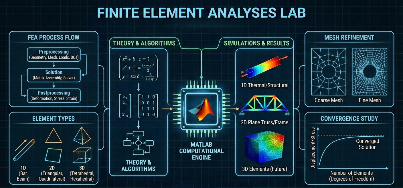 This lab course (NMEC535 - Finite Element Analyses Lab) provides hands-on training in developing algorithms and MATLAB codes for classical Finite Element Analysis of structural systems. Students learn to program various element types including linear and quadratic bar elements, plane trusses, plane frames, and Euler-Bernoulli beams for analyzing 1D, 2D, and 3D structures under static and dynamic loading conditions. The course emphasizes mesh convergence studies, error analysis, and culminates in a mini-project applying FEA to real-life structural problems.